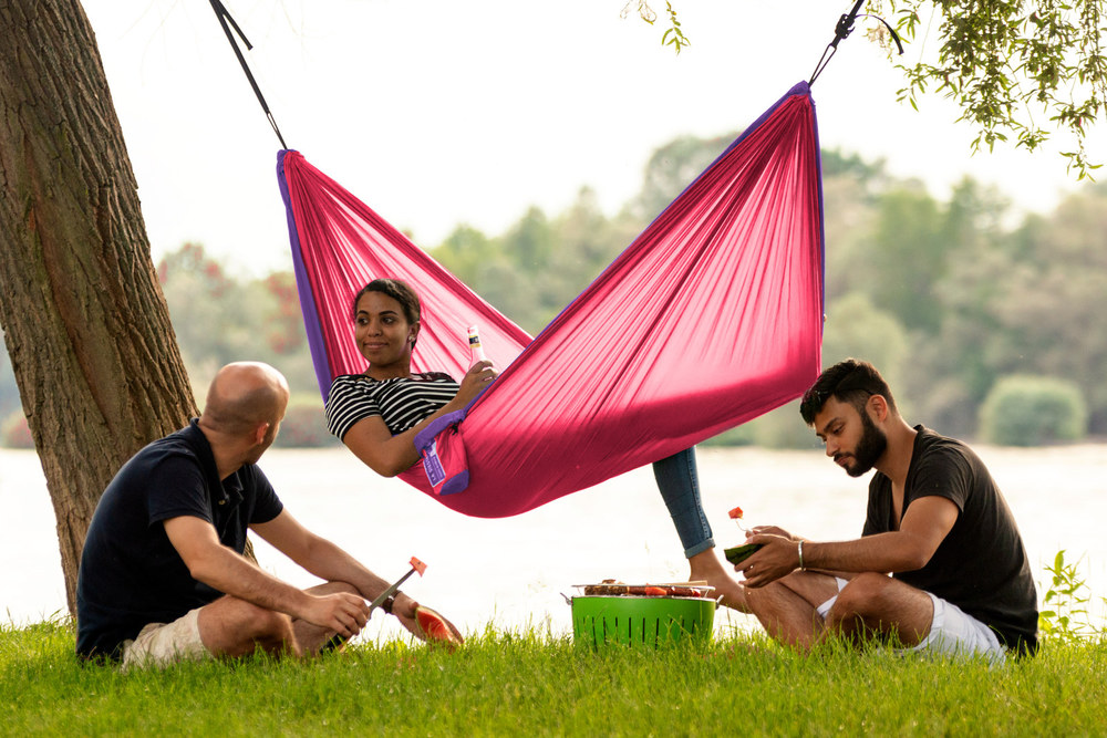 Az opcionális CrocodileHook alumínium kampók és a hevederek segítségével könnyen állítható a magasság. A 40 mm széles heveder optimálisan tartja a függőágyat és megvédi a fa kérgét.