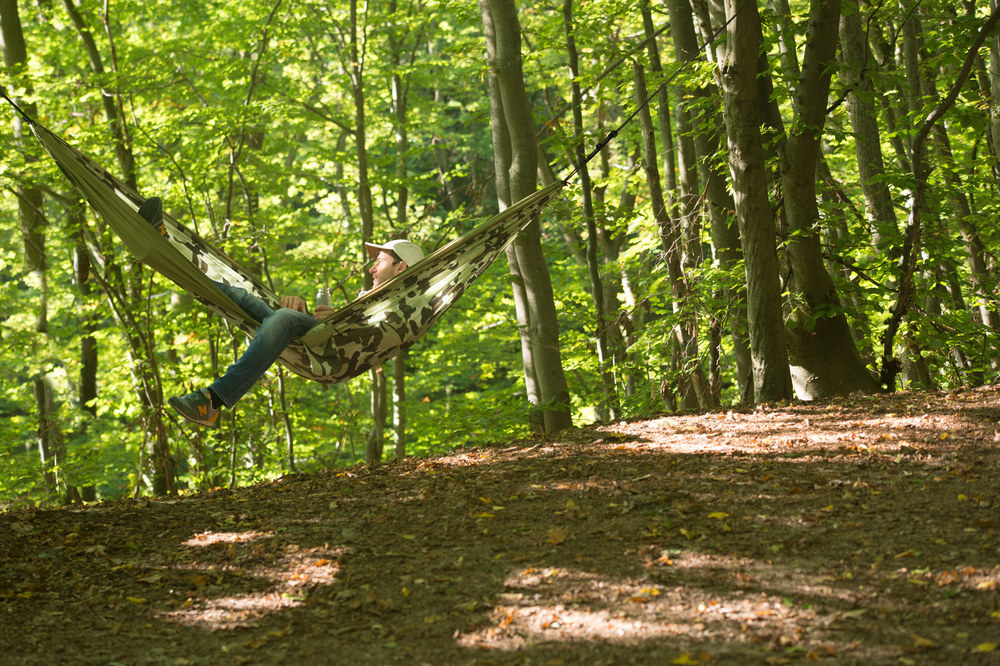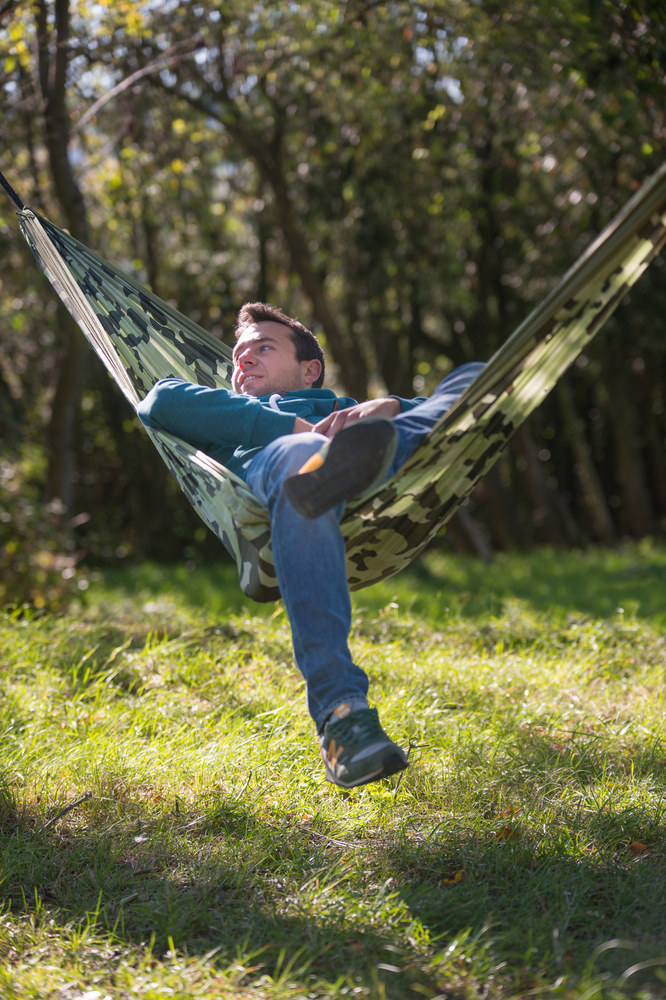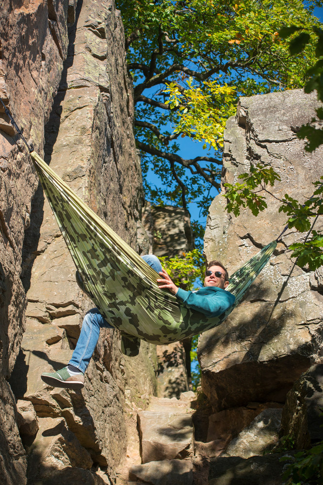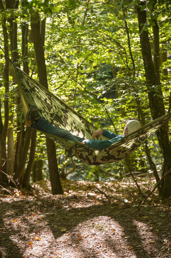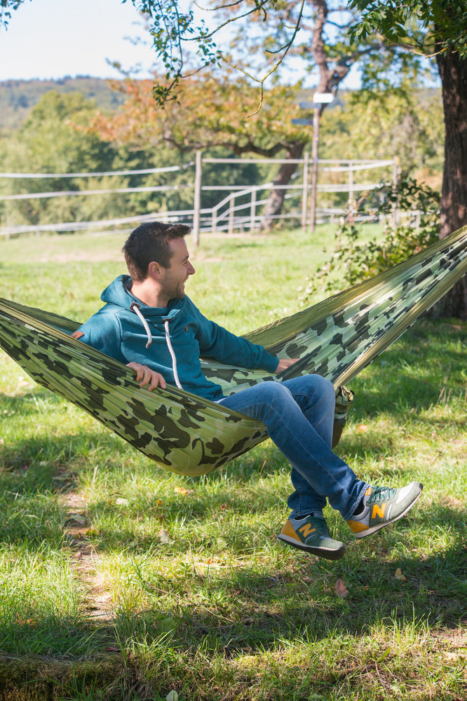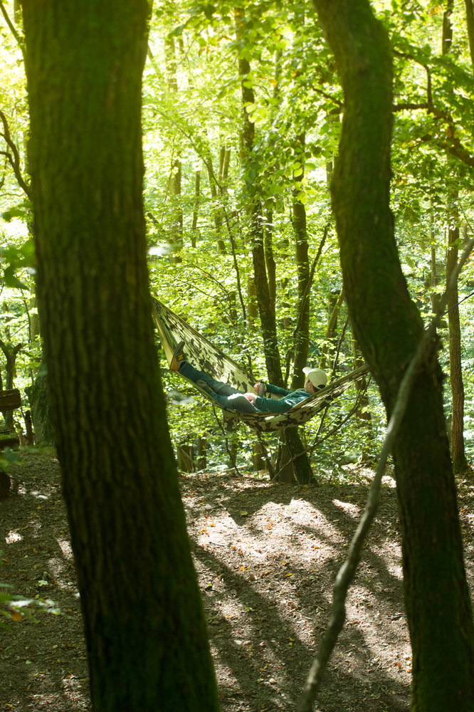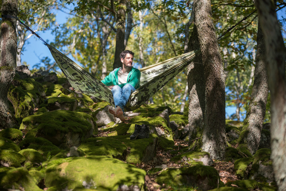 Az opcionális CrocodileHook alumínium kampók és a hevederek segítségével könnyen állítható a magasság. A 40 mm széles heveder optimálisan tartja a függőágyat és megvédi a fa kérgét.