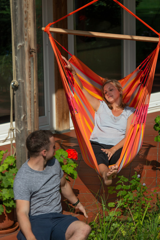 A Domingo függőfotelt egész nyáron a szabadban tarthatja! Anyaga HamacTex® (polipropilén), mely ellenáll az időjárás viszontagságainak, és nagyon gyorsan szárad. A HamacTex® mindazonáltal igen könnyen összetéveszthető a pamuttal, mivel küllemre, tapintásra is hasonlít a természetes anyaghoz. A Domingo Kolumbiában készül, ahol a függőszékek és –ágyak igazi nemzeti kincsnek számítanak, és évszázadok óta részét képezik a kulturális hagyománynak.