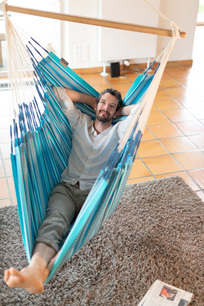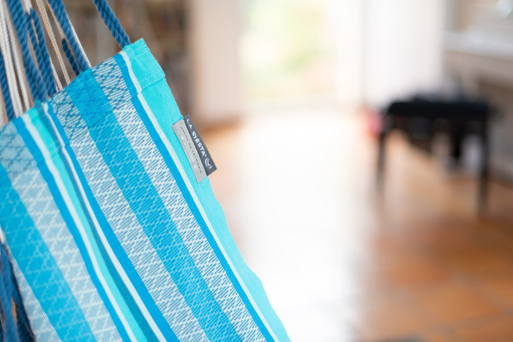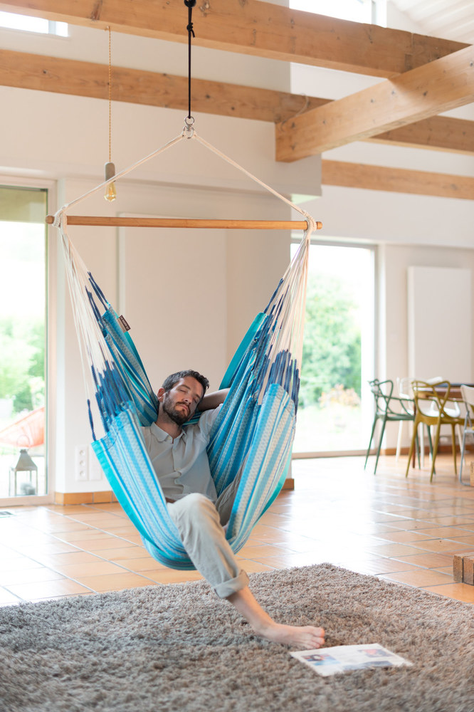 A Habana Azure függőfotel fantasztikusan kényelmes és tágas, organikus pamut anyagból készült - a súlytalanság érzetét biztosítja.