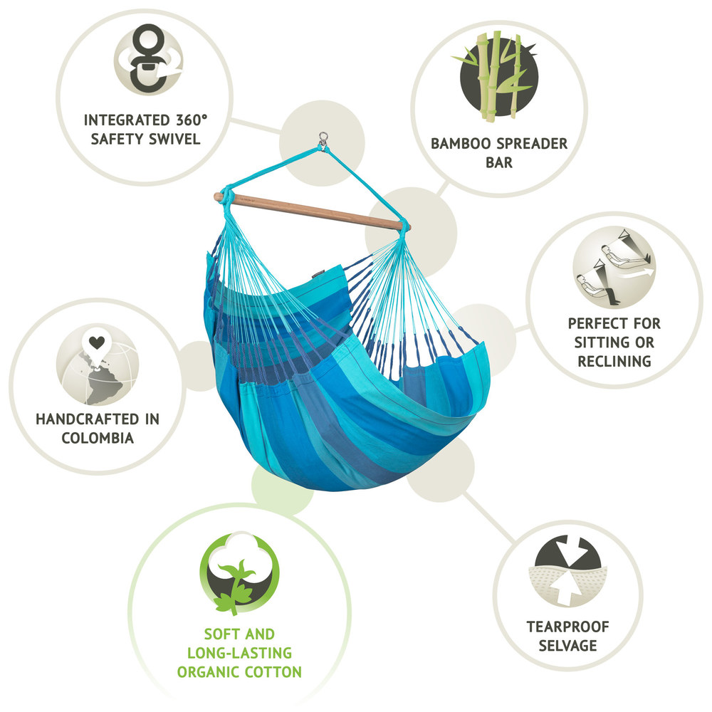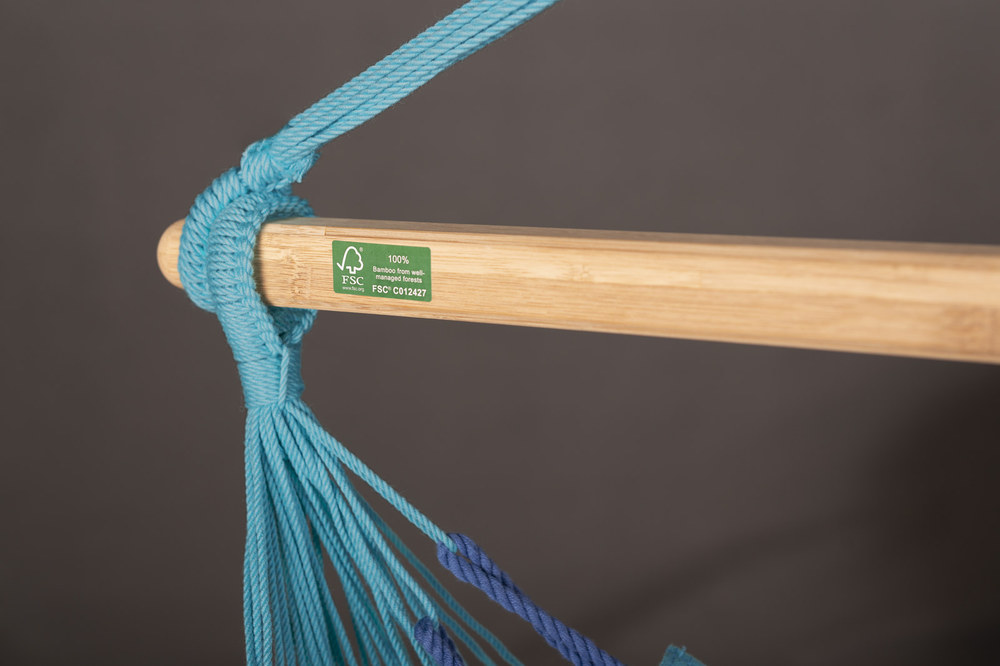 A nagyszámú zsinórzat a kolumbiai függőszékek általános jellemzője. A súlyeloszlás használat közben optimális a függőfotel a zsinóroknak köszönhetően maximális kényelmet nyújt, miközben igen strapabíró. A textil megerősített szélei nagy szakítószilárdságot biztosítanak a függőfotelnek. A beépített biztonsági forgószem biztonságos 360 fokos elforgást tesz lehetővé. A távtartó rúd csúcsminőségű bambuszból készült, amely nem csak vonzó küllemű, de rendkívül erős és vízálló. Emellett az sem elhanyagolható, hogy a függőágy fa alkotóelemei felelős erdőgazdálkodásból származnak(FSC®).