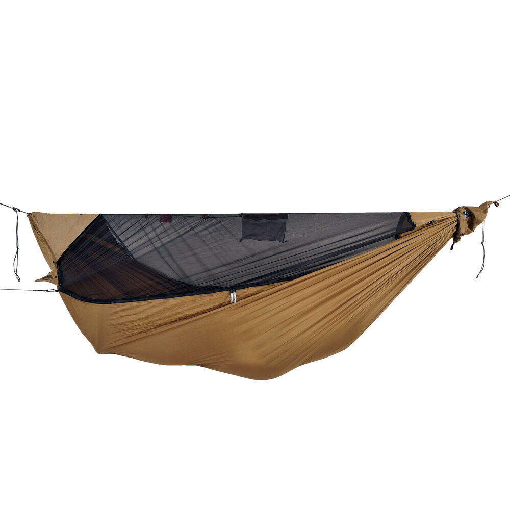 A legújabb a TTTM választékában a szúnyoghálóval egybeépített eredeti ejtőernyőselyemből készült túrafüggőágy. Könnyen használható megoldás a rovarvédelem mellett történő szabadban alváshoz. A kényelem és a funkcionalitás maximalizálva, a tömeg pedig minimalizálva.